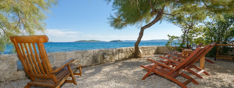 Vom Innenhof der Villa sind es nur wenige Schritte zum Meer und dem großartigen Archipel, denn sie liegt direkt am Strand. Hier stehen ebenfalls Liegen und Sonnenschirme zur Verfügung.